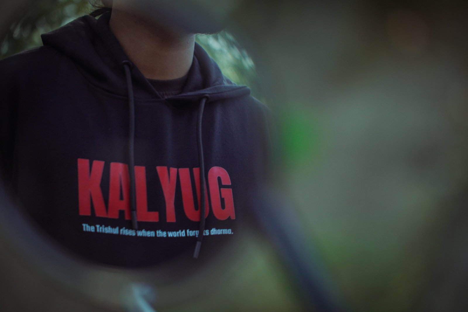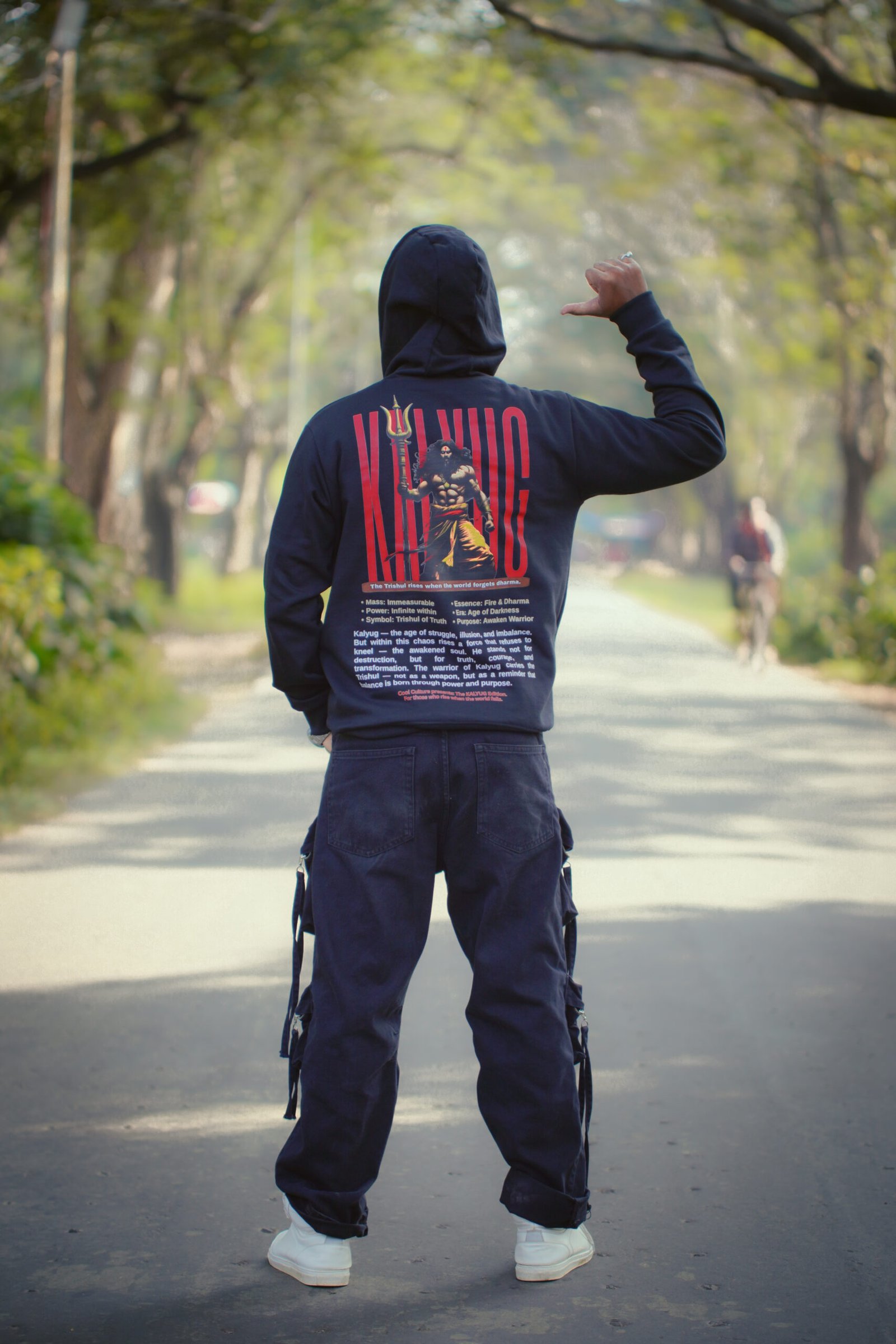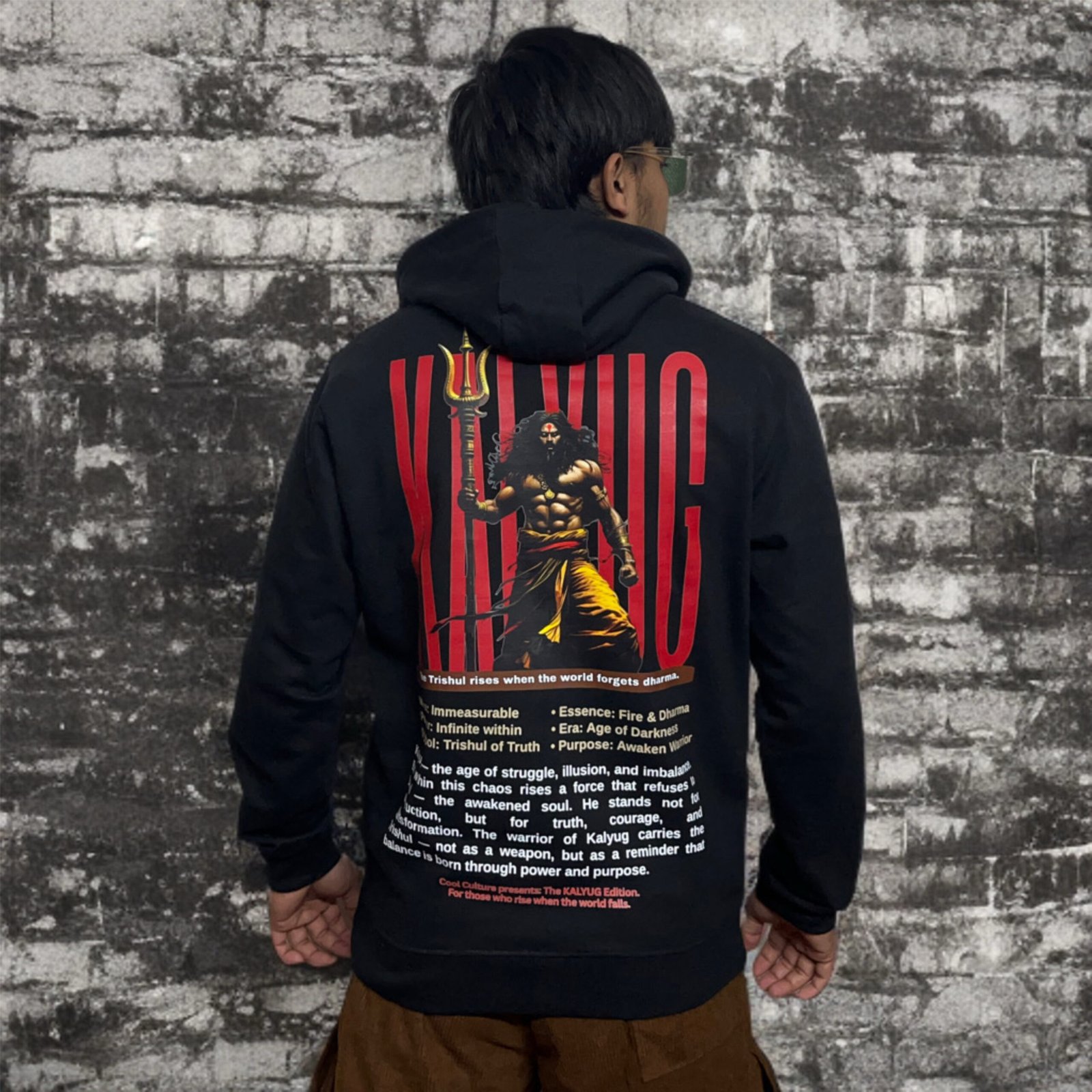 The bold KALYUG print on the front declares rebellion and purpose, while the back artwork tells the story of the Trishul — a symbol of truth, courage, and dharma.